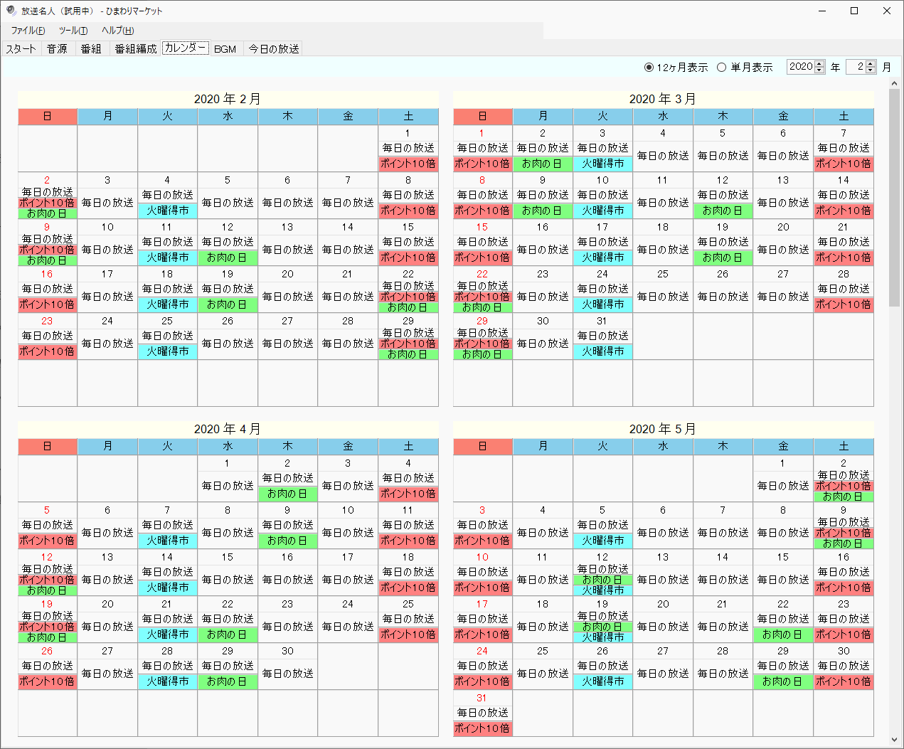 カレンダーには、その日に適用される番組編成が表示されます。また日をクリックして、その日に実行される番組の一覧を表示し、特別な番組をスケジュールしたりすることができます。