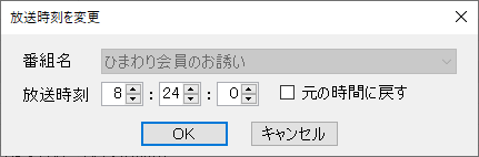 番組予定一覧で選択した番組予定を変更するには右側にある「変更」ボタンを押します。「放送時刻を変更」ダイアログが表示されます。