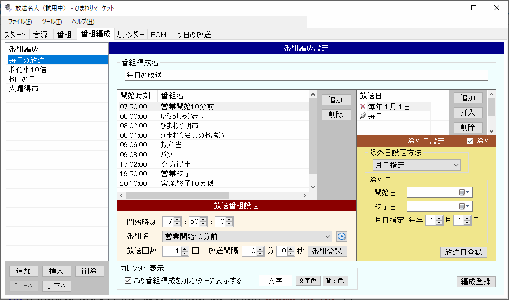 | この番組編成をカレンダーに表示する | チェックするとこの番組編成はカレンダーの放送日内に表示されます。 |