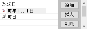 | 挿入 | 放送日一覧で選択されている放送日の前に、新しい放送日を追加します。 |