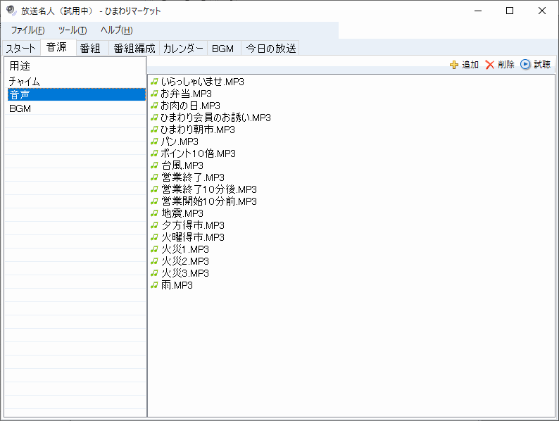画面左を用途ペインと呼びます。ここにはチャイム、音声、BGMの三つの用途が表示されています。チャイムは番組の開始や終了を知らせる短い音で、ジングルとも呼ばれます。音声は番組の本体となるメッセージです。BGMはバックグラウンドミュージックに用いられる音楽です。
