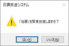 緊急放送時に使用します。緊急放送ボタンを押すと番組画面で緊急放送として登録されている全ての番組が表示されます。その中より放送したい番組を選択してクリックします。実行確認メッセージが表示されます。