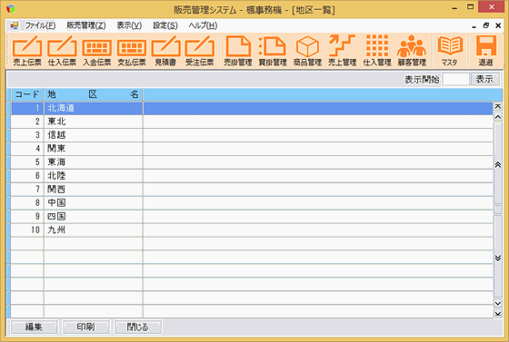 ツールバーの[マスタ]ボタンを押し[区分]をクリックすると区分の一覧が表示されますので編集する区分を選択します。選択すると地区一覧画面が表示されます。