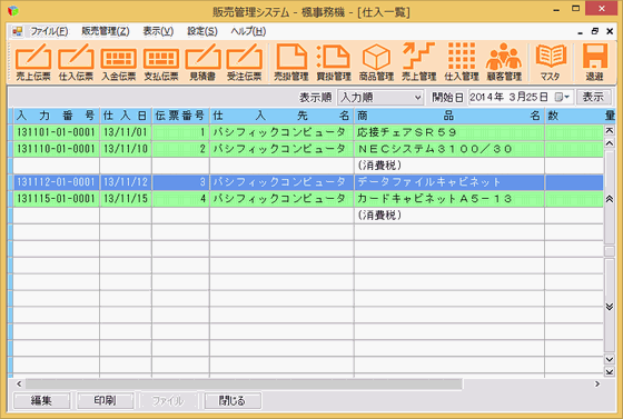 ツールバーの[仕入伝票]ボタンを押すと、仕入伝票一覧画面が表示されます。
