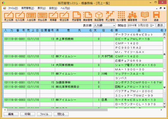 この画面より売上伝票の登録、修正、削除および印刷を行います。