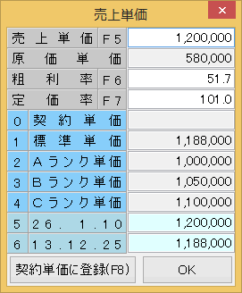 | 0.契約単価 | 得意先ごとの契約単価を表示します。 クリックすると売上単価にコピーされます。 |