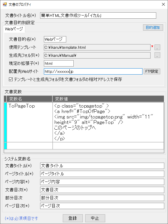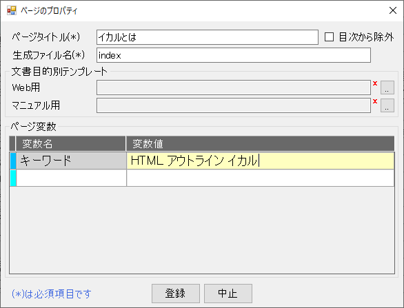 | 文書のタイトル名 | 文書のタイトルを設定します。 文書タイトルは通常はページに表示されませんが、変数[文書タイトル]を用いてHTMLファイルに表示することもできます。 (必須) |