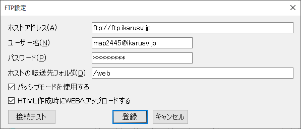 生成されたHTMLファイルをWEBサイトにアップロードするときの設定をします。