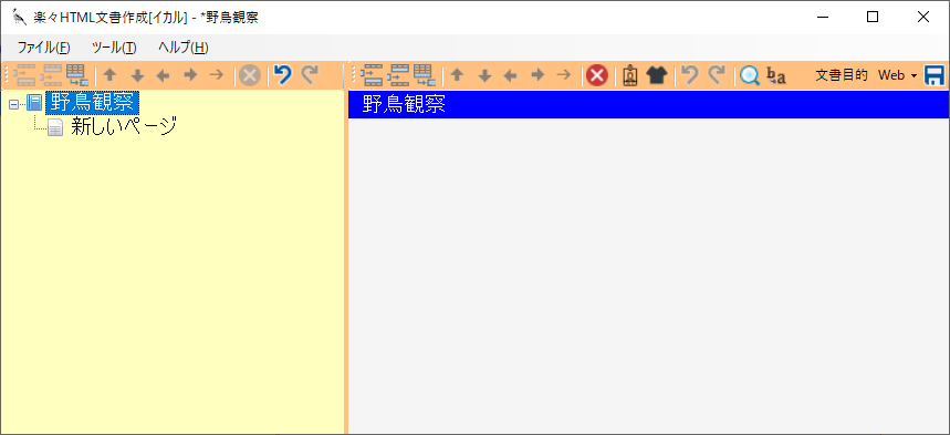 左側の領域には文書タイトル「野鳥観察」とその下に「新しいページ」が表示され、文書タイトルが選択された状態になります。