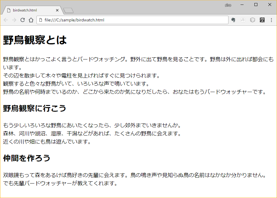 変換先フォルダ内にHTMLファイル birdwatch.html が作成され、既定のブラウザが起動して作成されたHTMLを表示します。