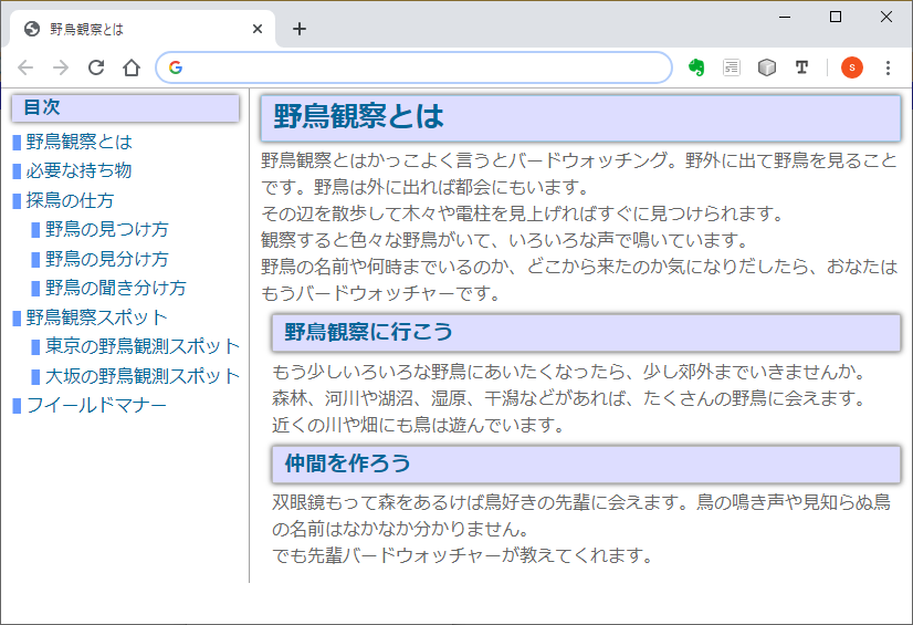 ここでは複数のページから構成される「野鳥観察マニュアル」を例に説明します。