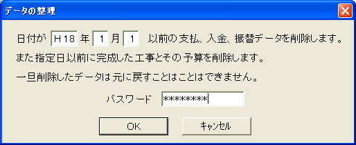指定した日付より前(指定日は含みません)の支払、入金、振替の各データを削除します。また指定日以前に完成した工事およびその予算を削除します。