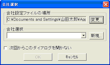 「会社選択」コンボボックスには会社設定ファイルの場所に指定したフォルダ内にある、会社設定ファイルの一覧が表示されますが、まだ会社データが作成されていませんのでは空白です。[新規]ボタンをクリックすると会社データが作成できます。