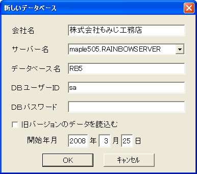 データベース名を入れます。通常はRB5にして下さい。複数の会社のデータベースを作る場合は、各々別の名前を付けて下さい。