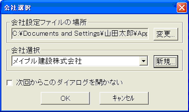 通常は既定の場所に会社設定ファイルを作って下さい。他の場所に変更する場合のみ[変更]ボタンを押します。