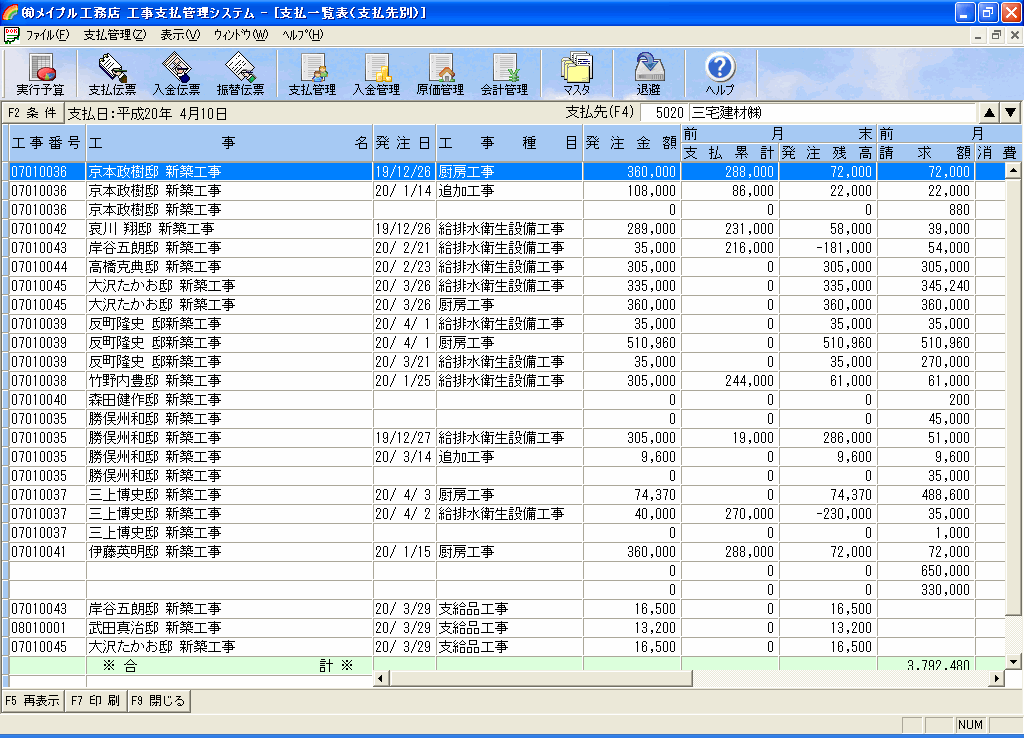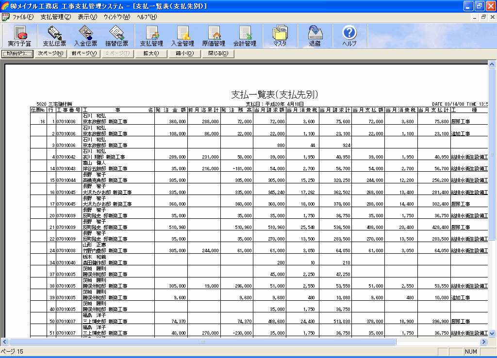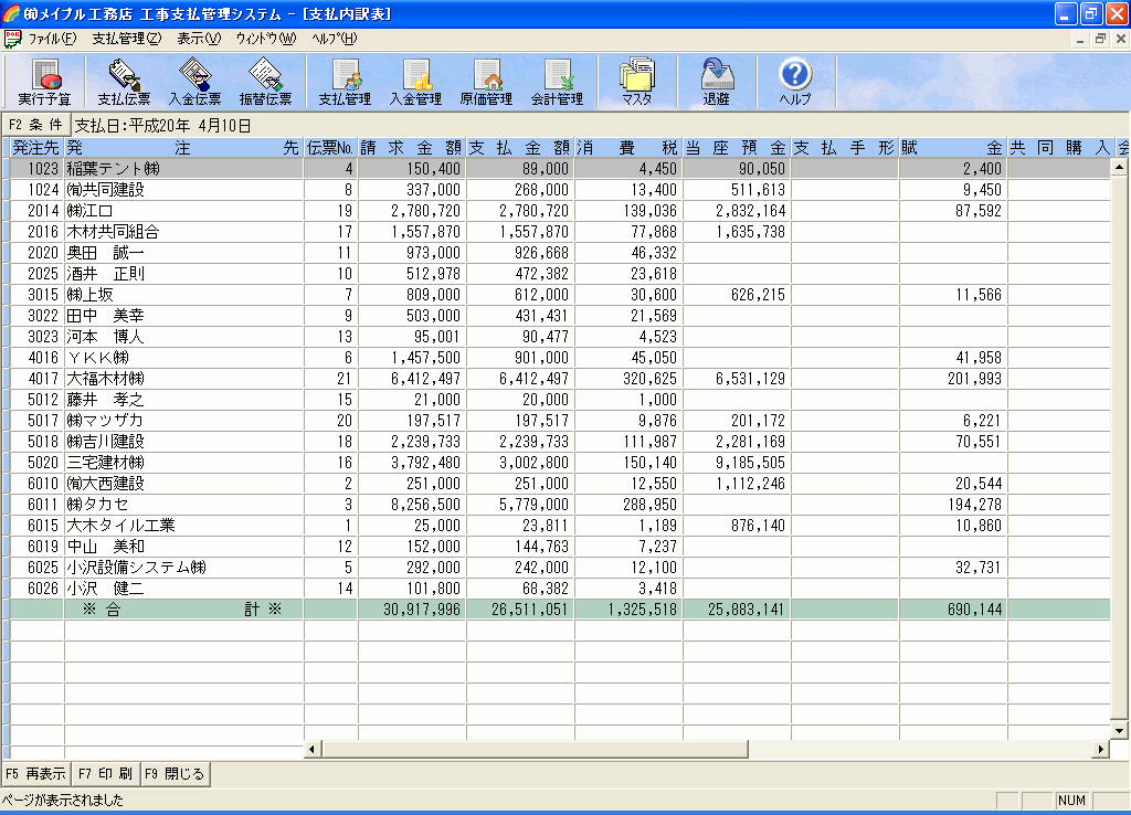 設定された条件により集計され、支払一覧表(支払先別)が画面表示されます。