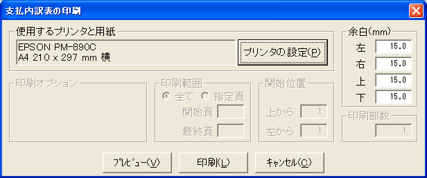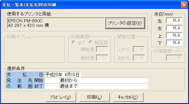 頁別帳票では印刷設定はプリンタと用紙と余白の設定の他にここで集計条件や印刷範囲を設定することができます。設定した値はパソコン毎に記憶され次回に表示されます。