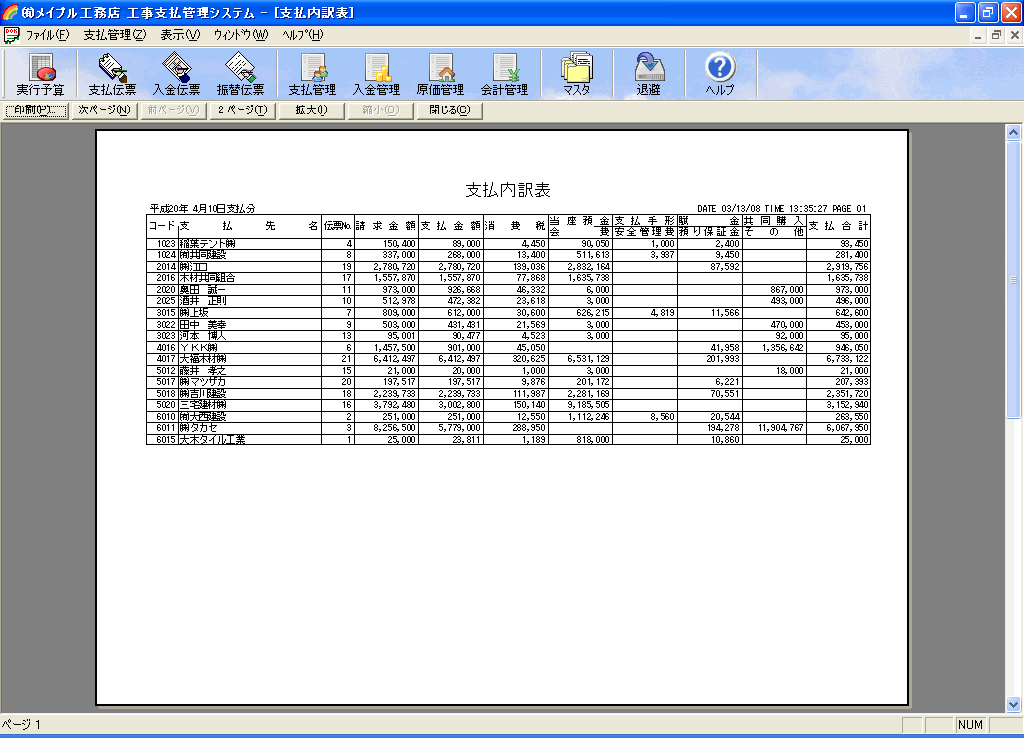管理表には支払先別支払一覧表や工事別支払一覧表のように支払先別や工事別に作成されるものと、支払内訳表のように全体で1つの管理表となるものがあります。前者を頁別帳票、後者を単一帳票と呼びます。