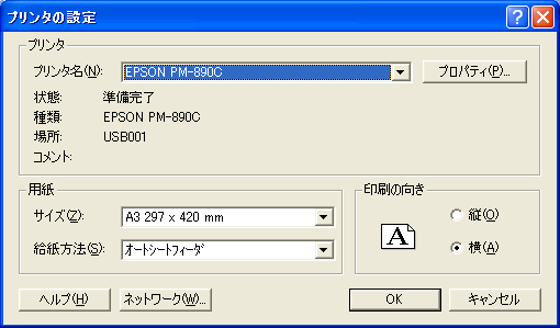 プリンタおよび用紙を変更します。プリンタ設定ダイアログが表示されます。