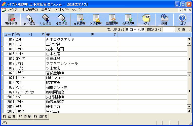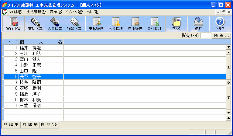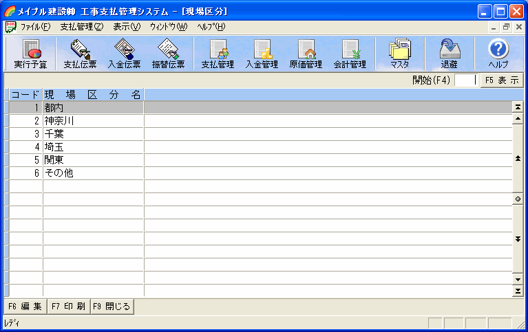 ツールバーの[マスタ]ボタンを押し[現場区分]選択すると現場区分一覧画面が表示されます。
