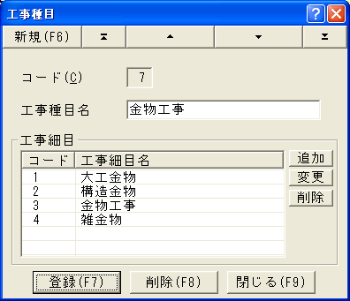 工事種目コードと工事種目名を登録および修正します。工事細目はこのダイアログの中より登録します。