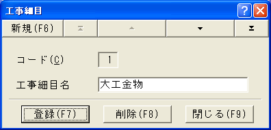 工事細目の登録には工事細目登録ダイアログが使われます。詳細は「5.2.3 工事細目登録ダイアログ」を参照して下さい。