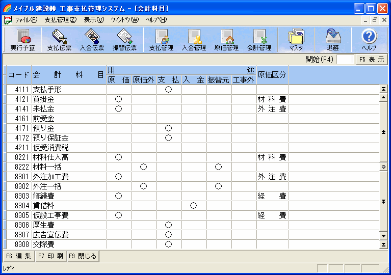 ツールバーの[マスタ]ボタンを押し[会計科目]選択すると会計科目一覧画面が表示されます。