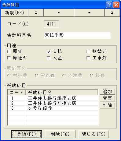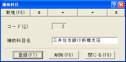 会計科目コードと会計科目名を登録および修正します。補助科目はこのダイアログの中より登録します。