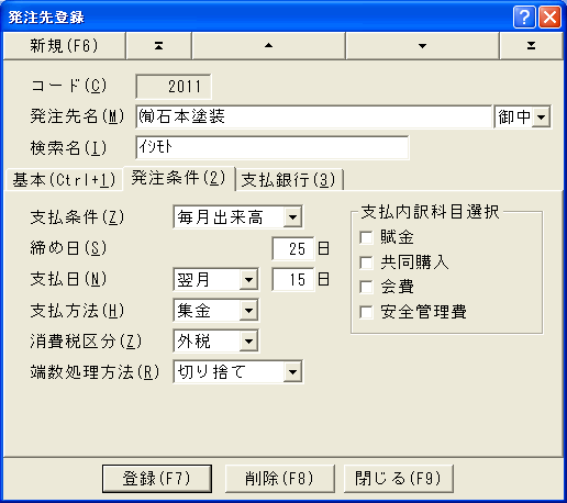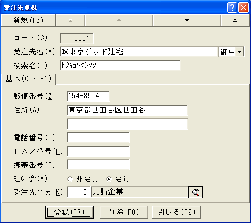 受注区分は受注先を分類するのに使用します。発注先区分は発注先を分類するのに使用します。個人区分は個人を分類するのに使用します。現場区分は現場を分類するのに使用します。物品区分は物品を分類するのに使用します。これらの使い方は自由です。例えば発注先を業種によって分類したり、現場を地域で分類することができます。