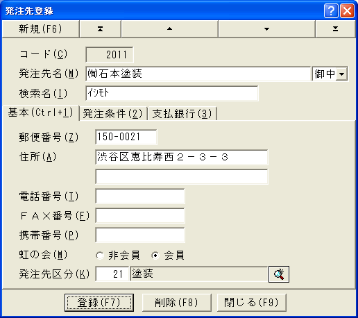 発注者コードを入力します。ボタンで選択することもできます。発注者は発注者マスタに登録されています。発注者が登録されていない場合はここで登録することもできます。