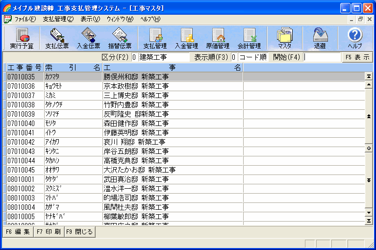 ツールバーの[マスタ]ボタンを押し[工事種目]選択すると工事種目一覧画面が表示されます。