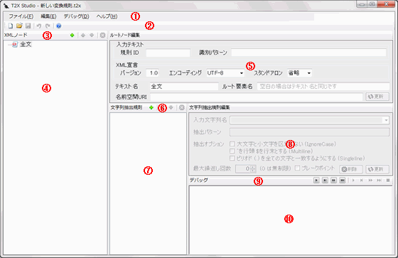 T2XスタジオはT2Xコンバータで使用するテキストファイルをXMLに変換する規則を、分かり易く効率的に作成するためのソフトウェアです。