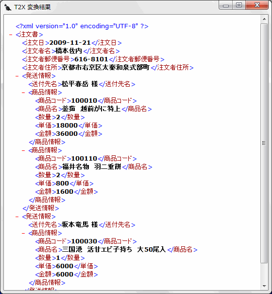 と表示されます。「はい」を押すとXMLファイルが所定の場所に作成され、変換結果ウィンドウに変換後のXMLファイルの内容を表示します。