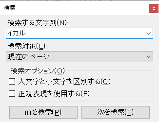 | 前を検索 | 現在の段落のカーソル位置より前方を検索します。 段落内の前方になければ前の段落を探します。 検索対象が「現在のページ」の場合、ページ先頭まで検索したらページの最後に戻ります。 検索対象が「文書内の全てのページ」の場合、ペーシ内の前方になければ前のページを探します。 |