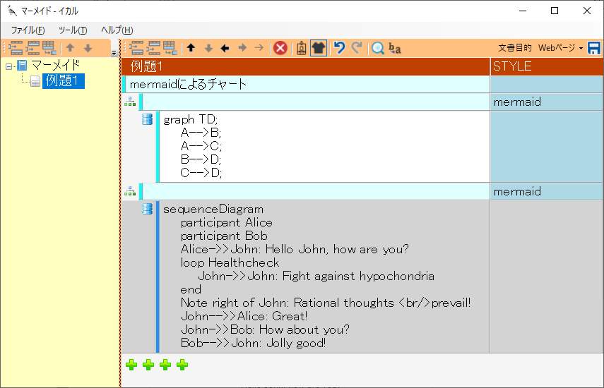 イカルのページで段落を作成し、段落種別にグループを設定します。またこの段落のスタイルに mermaid を設定します。