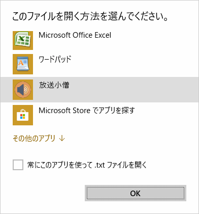 このとき「常にこのアプリを使ってファイルを開く」にチェックを付けてから「OK」ボタンを押すと、ファイルの拡張子と「放送小僧」が関連付けられ、以後簡単に開くことができるようになりますので、お好みにより設定して下さい。