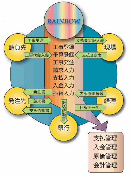 支払管理業務の中心となるデータは支払日に於ける業者に対する実際の支払です。支払業務を効率的に行うことは勿論ですが、この支払データに工事種別や会計科目等の付加情報を入力すれば付加的に工事原価管理や会計管理に必要な情報を得ることができます。RAINBOWはこの事に着目して作られたシステムです。